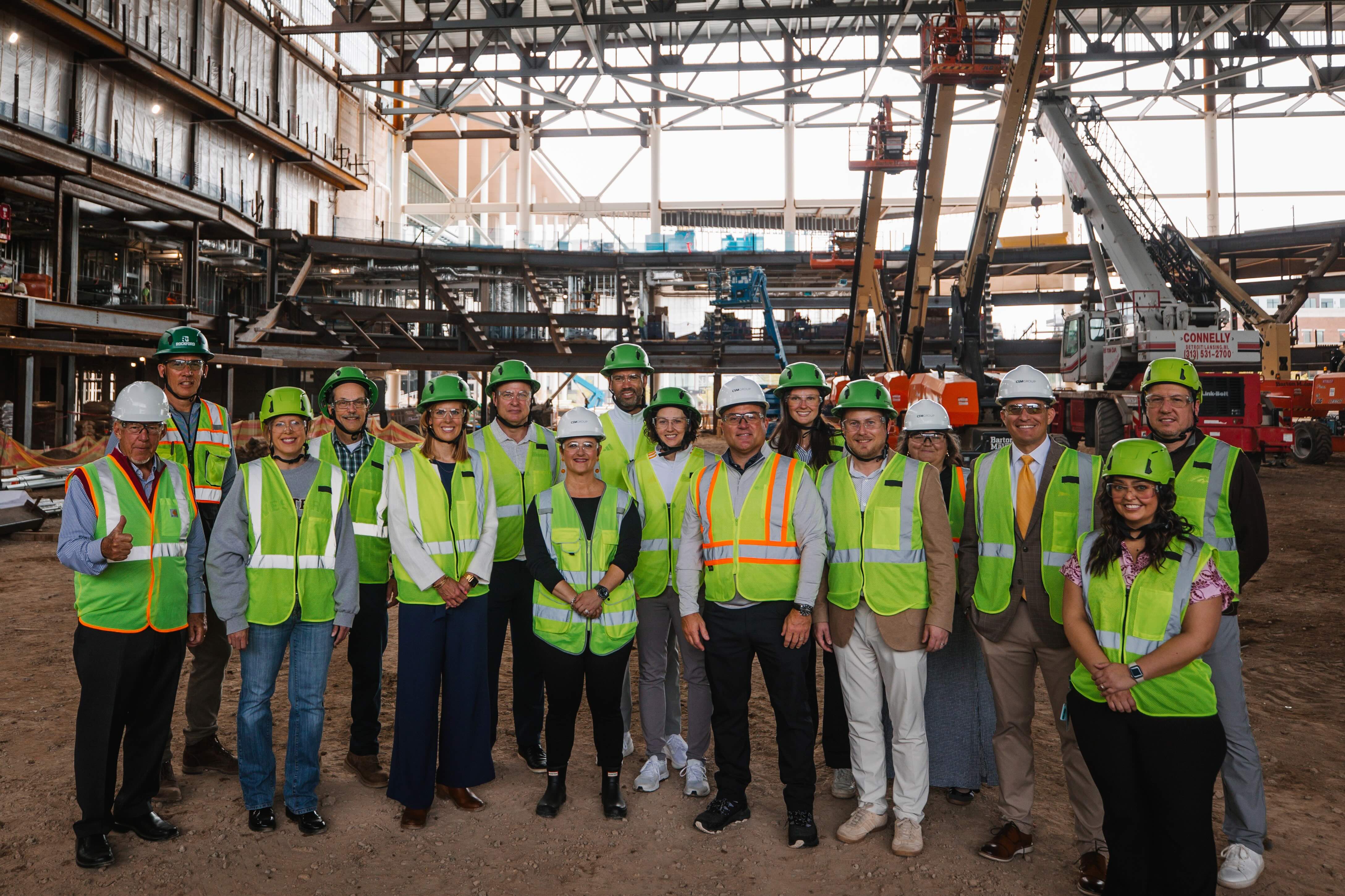The Kalamazoo Event Center reached a major milestone today with its official topping out, as project partners, community leaders, and construction crews gathered to celebrate the placement of the final steel beam.